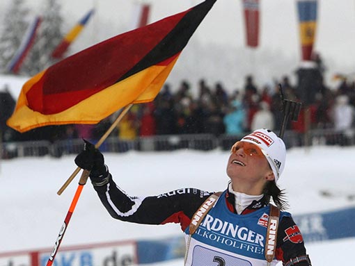 На первом этапе за сборную Германии бежала Тина Бахманн, которая передала эстафету Магдалене Нойнер второй, проигрывая несколько секунд команде Франции. Лидер сборной Германии попыталась оторваться от преследовательниц, что привело к штрафному кругу на второй стрельбе, и на третий этап немки снова ушли вторымы, но проигрывая около десяти секунд. Решающий вклад в победу немецкой дружины внесли Мириам Гёсснер, которая на третьем этапе вышла в лидеры, и Андреа Хенкель (на фото), которая смогла удержать преимущество над сборной Франции на последнем этапе, и финишировала с флагом, став восьмикратной чемпионкой мира.