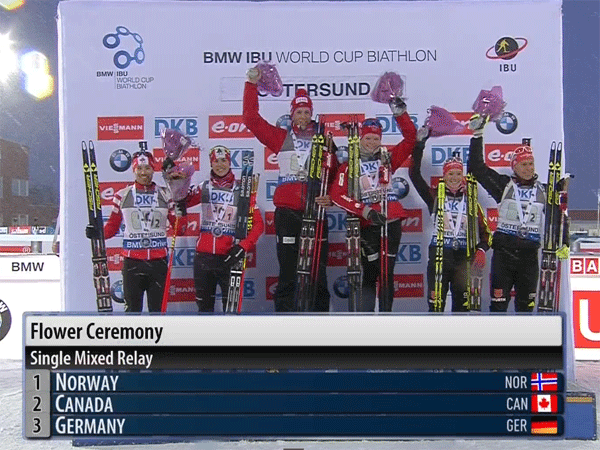 Остаётся только добавить, что первыми к финишу дистанции пришли французы Мари Дорен-Абер и Симон Фуркад, но из-за того, что на своём первом этапе Симон оставил незакрытой одну из мишеней они получили штрафное время, которое отбросило команду на последнее место.