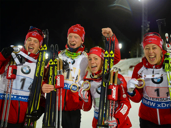 Норвежская четвёрка в составе которой на дистанцию выходили Фанни Хом Биркеланд, Тириль Экхофф, Йоханнес Бё и Тарье Бё преодолела эстафетную дистанцию за 1 час 11 минут 42,6 секунд, опередив финишировавших вторыми немцев на 33,6 секунды. Третьей к финишу пришла четвёрка из Чехии, которая отстала от победителей более чем на минуту.