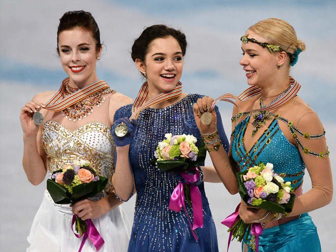После короткой программы у женщин лидировала американка Грейси Голд, но в произвольной программе она показала лишь шестой результат и в итоге осталась вообще без наград. В отличие от лидера 16-летняя москвичка Евгения Медведева занимала после первого дня соревнований лишь третье место, но потрясающее исполнение произвольной программы, в которой она установила мировой рекорд по набранным баллам - 150,10, вывело подопечную Этери Тутберидзе на первое место. 223,86 - такова победная сумма российской дебютантки мирового первенства, которая побила мировой рекорд установленный на Олимпийских играх 2010 года в Ванкувере кореянкой Ким Ён На.
