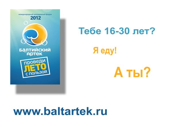До 25 апреля 2012 года можно принять участие в заявочной кампания для участников международного молодежного палаточного лагеря (форума) «Балтийский Артек-2012», организатором которого выступает Агентство по делам молодежи Калининградской области. Чтобы стать участником «Балтартека-2012», необходимо зарегистрироваться на сайте www.baltartek.ru, заполнить заявочную форму, пройти конкурсный отбор и оплатить организационный взнос. Участие в форуме предполагается в составе проектных команд от 2 до 6 человек. Возраст участников - 16-30 лет.