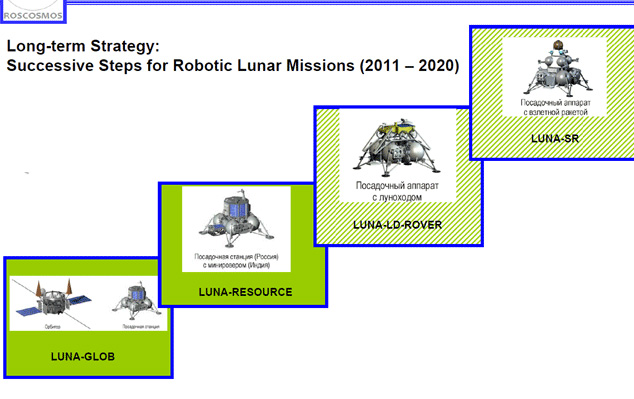 На первом этапе, который начнется в 2015 году, Луну будут исследовать зонды "Луна-Ресурс" и "Луна-Глоб". Один из них будет изучать южный полюс, куда планируется высадить российский посадочный зонд с индийским мини-ровером.