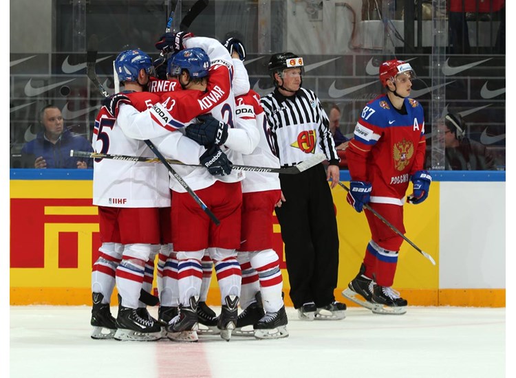 В играющей на московской "Арене Легенд" группе "А" в лидеры вышла сборная Чехии, которая в первом туре забила три безответных гола в ворота россиян. Счёт в матче на исходе 15-й минуты открыл Томаш Кундратек, в самом начале второго периода Роман Червенка наказал хозяев первенства за удаление, а итоговый счёт матча установил на 59-й минуте форварда ставшего чемпионом Чехии клуба "Либерец" Михал Бирнер, который поразил уже пустые ворота сборной России, когда её голкипер Сергей Бобровский был заменён на шестого полевого игрока. Лучшими игроками матча признаны российский нападающий Павел Дацюк, который так и не смог поразить ворота соперника, и чешский голкипер Доминик Фурх, отразивший все 25 бросков в створ своих ворот от сборной России.