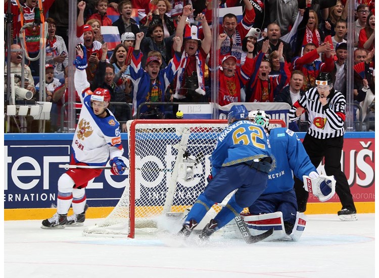 После поражения в первом туре от команды Чехии (0:3) болельщики хозяев чемпионата ожидали победы над только что вернувшимся в хоккейную элиту Казахстаном. С первых минут ведомые московскими трибунами россияне бросились в атаку и уже исходе седьмой минуты матча Евгений Даданов открыл счёт. Однако радость была недолгой - уже менее чем через три минуты в счёте повели казахи в составе которых на 9-й и 10-й минутах встречи отличились Дастин Бойд и Роман Старченко. Прошло ещё две минуты и вперёд после точных бросков Романа Любимова и Сергея Мозякина вышли уже россияне. И всё-таки первый период завершился вничью 3:3 - за 14 секунд до его окончания равновесие восстановил казахстанец Евгений Рымарев.