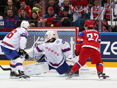 В матче против команды Норвегии главный тренер сборной России Олег Знарок дал отдохнуть сразу троим ведущим игрокам - защитнику Антону Белову, форварду Сергею Мозякину и вратарю Сергею Бобровскому. Однако и без них хозяева первенства смогли одержать пятую победу подряд. В первом периоде россияне перебросали соперника (12-5), но так и не смогли открыть счёт. Вторая двадцатиминутка по броскам осталась за норвежцами (11:9), но сборная России забила дважды. На 23-й минуте великолепно сыграл защитник Дмитрий Орлов, который обвёл соперника и выложил удивительный пас на клюшку Ивана Телегина, а рыжебородый форвард московского ЦСКА переправил шайбу в сетку. На 38-й минуте, когда норвежцы свои шансы уже упустили отличился и Артемий Панарин, которому отдал отличный пас Вадим Шипачёв. Итоговый же счёт 3:0 в пользу сборной России установил на 43-й минуте Роман Любимов, который поймал отскочившую от борта шайбу на крюк клюшки и в теннисной манере переправил её в сетку.