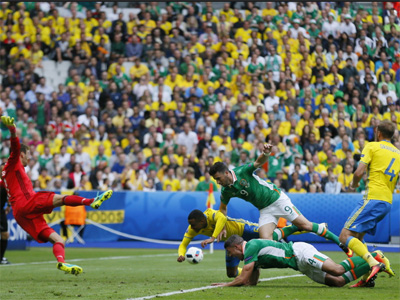 Уже на 8-й минуте гордые ирландцы заставили проявить все свое мастерство голкипера шведов Андреаса Исакссона. Джефф Хендрик пробил издали в нижний угол и вратарь викингов кончиками пальцев перевел мяч на уголовой.