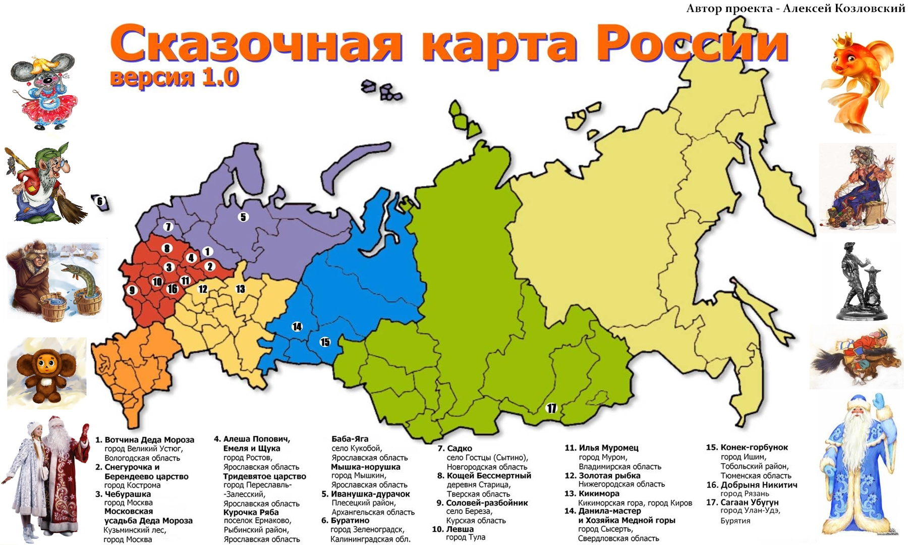 Социальный проект "Сказочная карта России", стартовавший в ноябре 2010 года, призван объединить всю имеющуюся информацию о местах рождения или существования героев сказок и былин, сообщает РИА "Новости". К настоящему времени на этой карте отмечены Ростов с такими персонажами, как Царевна-Лягушка и Алеша Попович, Москва и Великий Устюг (Дед Мороз), Тверская область (Змей Горыныч и Кощей Бессмертный), Кострома (Снегурочка) и многие другие города и поселки.