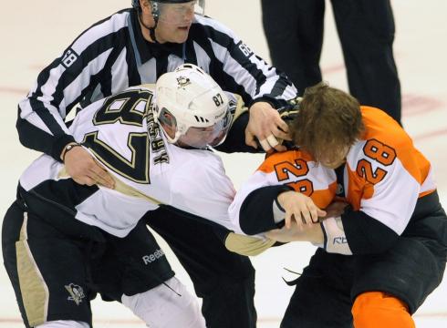 Первая стычка между Заком Ринальдо ("Флайерс") и Дериком Энгеландом ("Питтсбург") произошла уже на третьей минуте, а спустя десять минут состоялось первое массовое побоище, в котором приняли участие как лидеры команд Клод Жиру ("Флайерс") и Сидней Кросби ("Пингвинз") (на фото), так и другие полевые игроки. В результате этой потасовки команды "заработали" 46 минут штрафа, а всего в матче они набрали 158 минут! Только в этом показателе "Питтсбург" обошел хозяев - 89 минут штрафа против 69-ти.