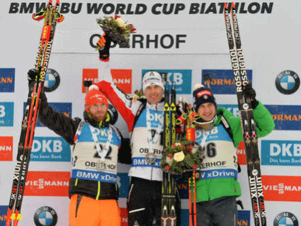 Второе место досталось чеху Мартину Шлезингру, который также оставил незакрытой лишь одну мишень, но ходом проиграл победителю 10,8 секунды. "Бронзу" в оберхоффеском спринте завоевал итальянец Доминик Виндич. Со старта запланированной на субботу, 7 января, гонки преследования он уйдёт на 40,3 секунды позже Эберхарда.