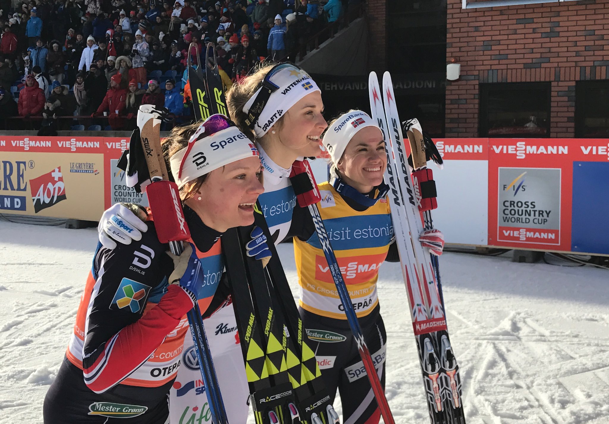 Шведка Стина Нильссон (на фото в центре) заняла первое место в спринте свободным стилем на этапе Кубка мира по лыжным гонкам, который проходит в эстонском Отепя. Нильссон выиграла финальный забег со временем 2 минуты 49,96 секунды. Второе и третье место заняли норвежки Майкен Касперсен Фалла (на фото слева, +0,27) и Хейди Венг (на фото справа, +3,75) соответственно.