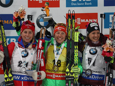 Все три медалистки прошли без ошибок оба огневых рубежа. Дальмайер преодолела дистанцию в 7,5 километров за 20 минут 43,7 секунды, опередив занявшую второе место Экхоф на 8,4 секунды. Занявшая же третье место Шевелье проиграла победительнице 41,6 секунды.