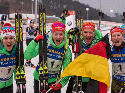 Ни отсутствие в составе четвёрки лидера сезона Лауры Дальмайер, ни штрафной круг, ни подтаивший снег на корейской биатлонной трассе, где через год пройдёт зимняя Олимпиада, не смогли помешать команде Германии набрать 300 баллов из 300 возможных в эстафетном зачёте нынешнего сезона. Преодолев четыре 6-километровых этапа за 1 час 7 минут 35,6 секунды, они одержали уверенную победу, даже несмотря на то, что Франциска Хильдебранд финишировала с флагом, опередив ближайших преследотельниц на 23 секунды.