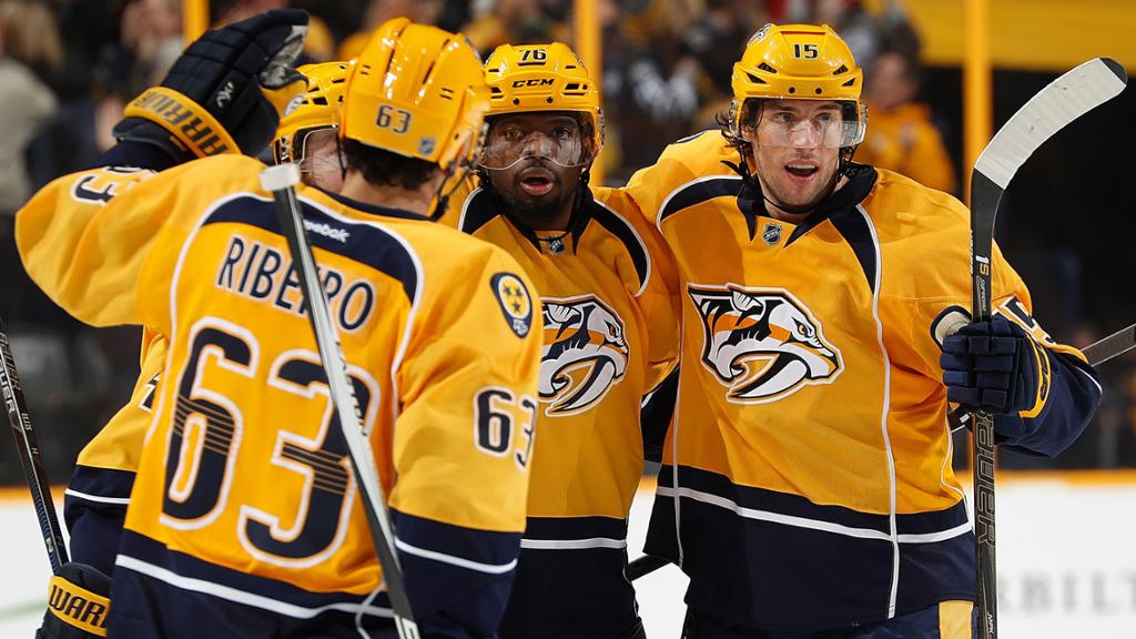 На 12-й минуте Колин Уилсон с передачи Пи Кей Саббана (на фото в центре) вывел "Хищников" вперед, когда "Блюз" был в меньшинстве. В начале второго периода экс-защитник "Канадиенс" уже сам поразил ворота "Сент-Луиса". Хозяева сократили спустя шесть минут (Колтон Парайко), но Саббан сделал еще одну голевую передачу на Филипа Форсберга и "Нэшвилл" ушел на второй перерыв, ведя в счете 3:1.