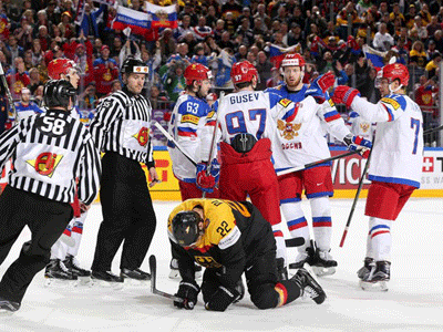 Россияне, игравшие против сборной Германии, после двух первых периодов вели со счётом 5:0, но в заключительной двадцатиминутке позволили хозяевам немного улучшить своё положение, забив три шайбы. После победы со счётом 6:3 подопечные Олега Знарка с восемью очками вышли на первое место в группе А.