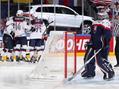 Американцы вслед за россиянами послали шесть шайб в ворота словаков. Джонни Годро отметился дублем и результативной передачей. Для американцев эта победа стала пятой на нынешнем турнире и они, выйдя на первое место, гарантировали себе участие в плей-офф. В последнем туре им предстоит матч за победу в группе с командой России, которая пока отстаёт на одно очко, но имеет в запасе матч с Латвией, который будет сыгран 15 мая. Словаки же проигрывают в пятый раз подряд и при некоторых раскладах могут даже покинуть мировую хоккейную элиту.
