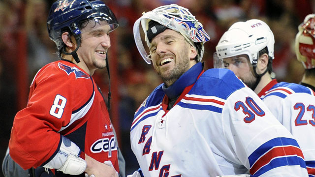 "Столичные" в первом периоде после голов Майка Кнубла и Джейсона Чимеры повели в счете 2:0, но к началу третьего периода "Рейнджерс" усилиями Брэда Ричардса и Райана Кэллахана восстановил ничью - 2:2, которая, к печали нью-йоркских болельщиков, продержалась лишь пять с половиной минут - на 53-й минуте Алекс Овечкин (на фото с голкипером "Нью-Йорк Рейнджерс Хенриком Лундквистом) реализовал численное большинство, принеся победу "Кэпиталз" - 3:2. Счет в серии после двух матчей сравнялся - 1:1. Следующие два поединка состоятся в Вашингтоне.