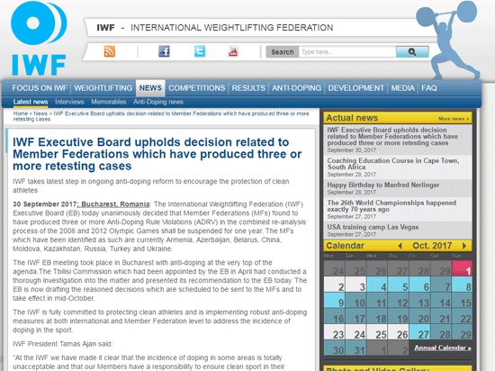 Исполком Международной федерации тяжелой атлетики, прошедший 30 сентября 2017 года в Бухаресте, принял беспрецедентно жесткое решение в отношении тех стран, представители которых были уличены в нарушении антидопинговых правил в ходе перепроверки проб с Олимпиады-2008 в Пекине и Игр-2012 в Лондоне.