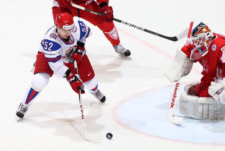 Россияне удачно начали матч. В начале третьей минуты Евгений Медведев точно бросил от синей линии и зажег красный свет за воротами сборной Дании. Однако уже через две минуты шайба оказалась и в воротах сборной России. Ларс Эллер вошел в зону и бросил в сторону ворот, которые в этом матче защищал Константин Барулин. Шайба летела мимо, но задев конек защитника изменила траекторию и попала в сетку.