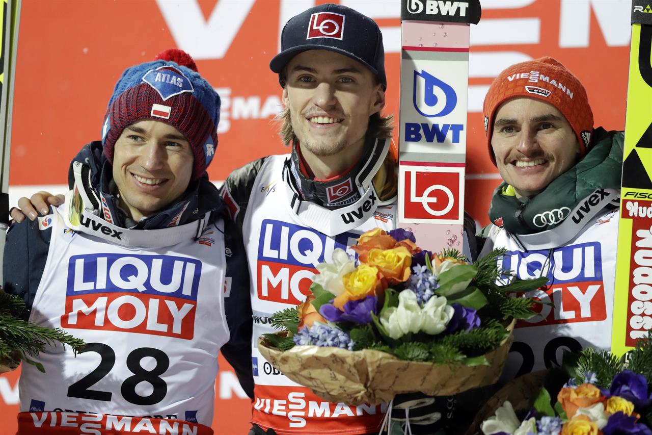 В Германии завершились состязания чемпионата мира по полетам на лыжах в личном зачете. Обладателем золотой награды стал 23-летний норвежец Даниэль Андре Танде (на фото в центре).