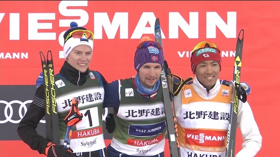 21-летний эстонский двоеборец Кристьян Ильвес (на фото слева) показал лучший результат в карьере, завоевав серебряную медаль на этапе Кубка мира, который завершился в японском городе Хакуба. Успеху Кристьяна способствовало отличное выступление в первом виде программы - прыжках с трамплина, после чего он захватил лидерство, набрав 123,3 балла. По итогам лыжной гонки Ильвес уступил только норвежцу Яну Шмиду (на фото в центре), сумев финишировать вторым. Третье место занял японец Акито Ватабе (на фото справа).