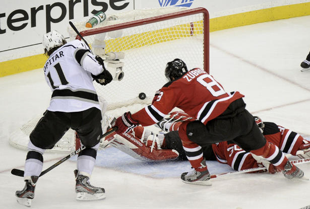 Матч в Нью-Джерси прошел под диктовку "королей". В основное время матча, к удивлению зрителей, гости перебросали "дьяволов" - 22:15, а первая шайба влетела в ворота Мартина Бродера уже на 10-й минуте - гол с передачи Джордана Нолана забил центрфорвард четвертого звена Колин Фрэйзер. Только на 39-й минуте хозяева усилиями Антона Волченкова сравняли счет. Однако, как и раньше, победную шайбу забросили игроки "Лос-Анджелес Кингз" - в овертайме приговор "дьяволам" привел в исполнение словенец Анже Копитар (на фото слева во время взятия ворот Мартина Бродера).