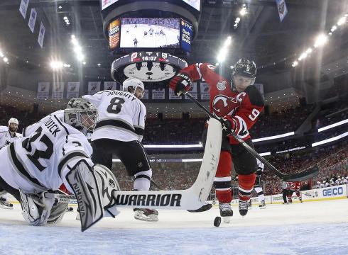 Счет в матче на 8-й минуте открыл защитник "Лос-Анджелеса" Дрю Даути. "Дьяволы" атаковали чаще, но вновь творил чудеса кипер Джонатан Куик (на фото вратарь отражает бросок капитана "Нью-Джерси" Зака Паризе). Только на 43-й минуте хозяевам удалось пробить Куика - шайбу забросил Райан Картер. Но этот гол стал "пирровым" - ни в основное, ни в дополнительное время Куику больше забить не смогли. В овертайме "короли" перехватили инициативу, нанеся за неполных четырнадцать минут 11 бросков по воротам Мартина Бродера. Когда табло отсчитало 73 минуты и 42 секунда Картер установил окончательный счет - 2:1. Но к несчастью для болельщиков "дьяволов", шайбу забросил не Райан, а Джефф Картер.