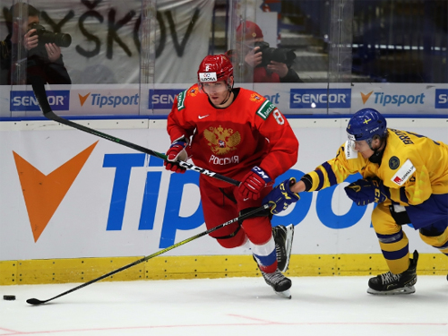 В первом полуфинальном матче встречались выигравшая до этого все пять матчей сборная Швеции и впрыгнувшая в последний момент в стадию плей-офф команда России. Шведы на групповом этапе заняли первое место в группе А, а россияне финишировали третьими в группе В. В первом раунде плей-офф сборная Швеции забила пять безответных шайб в ворота хозяев первенства чехов, а россияне одолели сборную Швейцарии со счётом 3:1. И вот теперь судьба путёвки в финал решалась в их очном поединке.