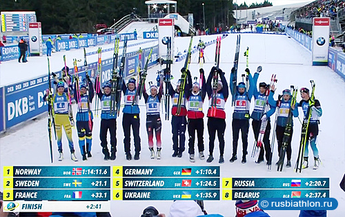 Сборная России, которую в отсутствие из-за болезни в Оберхофе Екатерины Юрловой-Перхт, представляли Кристина Резцова, Анастасия Поршева, Светлана Миронова и Лариса Куклина с огромным трудом вскарабкалась даже за итоговое седьмое место. Не было ни скорости, ни стрельбы. Лишь ошибки соперниц позволили показать такой результат. После первого этапа, когда Резцова использовала все шесть своих дополнительных патронов, россиянки шли на 15-м месте, а потом постепенно поднимались по протоколу, уступив в итоге норвежкам 2 минуты 21 секунду. Это седьмое место оставило за россиянками четвёртую позицию в общем зачёте (130 баллов).