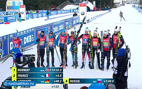 Тренеры сборной России решили поберечь своих лидеров Александра Логинова и Матвея Елисеева перед гонками с общего старта и внесли в протокол молодёжную версию своеё четвёрки. На дистанцию выходили Карим Халили, Евгений Гараничев, Никита Поршнев и Эдуард Латыпов, которые показали очень неплохую стрельбу, использовав за восемь заходов на стрельбище только 9 запасных патронов, но всё-таки ходом уступили Норвегии 1 минуту и 9 секунд, финишировав на четвёртой позиции.