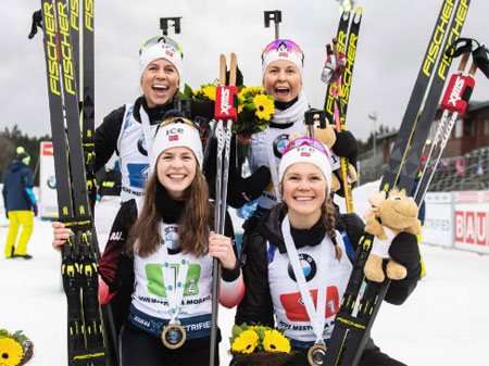 Норвежские тренеры позволили себе поэкспериментировать с составом, но всё равно четвёрка за которую выступали Каролин Кноттен, Ида Лиен, Ингрид Тандреволд и Тириль Экхофф во многом за счёт усилий двух последних вновь вырвала победу. Преодолев четыре этапа по 6 километров с восемью дополнительными патронами за 1 час 9 минут и 15 секунд сборная Норвегии опередила на 29 секунд представительниц Франции, которые успели пробежать штрафной круг и воспользоваться 10 доппатронами. Третий результат показали немки, которых на пьедестал буквально втащила Денизе Херманн, обошедшая за последний круг команды Украины и России.