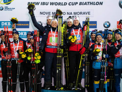 В чешском Нове Место в рамках седьмого этапа Кубка мира по биатлону прошла последняя мужская эстафета сезона 2019/20 годов. Победу в ней одержали представители Норвегии, ставшие лучшими в эстафетном зачёте Кубка, вторыми финишировали украинцы, которые впервые в нынешнем сезоне поднялись на подиум в этом виде программы, а третье место досталось сборной Швеции. Российская четвёрка в которой не было лидера сезона Александра Логинова завершила дистанцию четвёртой.