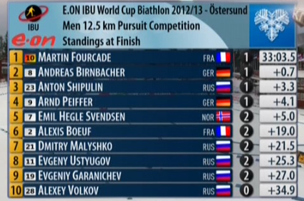 В воскресенье, 2 декабря, в последний день первого этапа Кубка мира по биатлону в шведском Эстерсунде состоялась мужская гонка преследования, которая принесла победу французу Мартену Фуркаду, вышедшему в лидеры общего зачёта. "Серебро" досталось немцу Андреасу Бирнбахеру, а "бронзу" - россиянину Антону Шипулину. Всего же в десятку лидеров по итогам первого в сезоне "персьюта" вошли пять россиян.