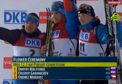 Ещё один россиянин Евгений Гараничев (на фото слева), уйдя со старта вторым лишь после своего единственного промаха на последнем огневом рубеже позволил на ненадолго выйти вперёд чеху Ондржею Моравецу, но очень быстро исправил положение, обойдя его на дистанции и завоевав свою шестую в карьере серебряную медаль Кубка мира. Для Моравеца, стартовавшего с 11-го места, и "бронза" в этой гонке стала настоящим подвигом, ведь только он и Малышко закрыли все 20 мишеней.
