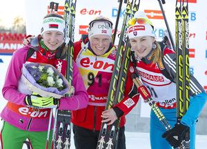 Третье место в масс-старте досталось белоруске Дарье Домрачевой, которая с тремя промахами не только обогнала на последнем километре дистанции стрелявшую без промаха француженку Анаис Бесконд, но и показала самую лучшую скорость в гонке.
