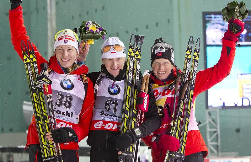 Хотя лучшая биатлонистка нынешнего сезона норвежка Тора Бергер (на фото справа) заняла в гонке лишь третье место, проиграв Гвиздон 13,7 секунд, этого ей хватило, чтобы гарантировать себе победу в общем зачёте Кубка мира сезона 2012/13 годов. Главная и, пожалуй, единственная конкурентка Бергер в борьбе за Большой Хрустальный Глобус - белоруска Дарья Домрачева - завершила дистанцию с пятым результатом и теперь уже точно не сможет за оставшиеся гонки выйти на первое место. У норвежки перед последним этапом, который пройдёт в российском Ханты-Мансийске, 1165 очков, а у Домрачевой - на 217 очков меньше.