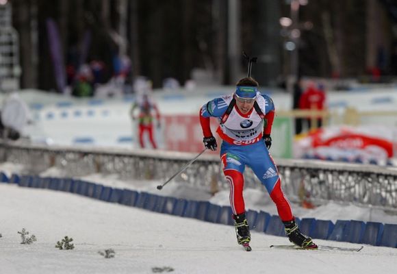 Первый этап на котором Россию представлял Антон Шипулин довольно неожиданно завершился победой Яна Савицкого из команды Казахстана, а в группе лидеров после первой передачи эстафеты помимо россиян оказались команды Австрии, США и Чехии. Резко ухудшил положение хозяев этапа и Олимпиады-2014 дебютант эстафетной команды Александ Логинов. Заработав в стрельбе из положения лёжа штрафной круг, он откатился на 14-е место, проигрывая почти минуту вышедшим в лидеры австрийцам. Однако Логинов не опустил руки, а продолжил борьбу и, удачно преодолев второй огневой рубеж, сократил отставание от лидеров до 38 секунд, чем очень помог своим старшим товарищам - Дмитрию Малышко и Евгению Устюгову, которые представляли Россию на двух последних рубежах.