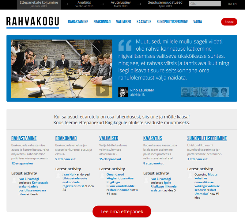 интернет-проект «Народное собрание» был запущен в Эстонии 7 января 2013 года для сбора пожеланий, касающихся изменения законов о партиях и выборах. Предложения поступали от представителей общественности, политиков и рядовых граждан.
