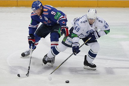 Довольно неожиданно для питерских болельщиков, которых на матче собралось больше 12000, и самого СКА уже на исходе первой минуты шайба побывала в воротах хозяев. Динамовцы отличились в первой же своей атаке - цели достиг дальний бросок защитника Яласваары, заставшего врасплох голкипера СКА Илью Ежова. Далее москвичи уверенно отбивали атаки хозяев весь первый период, а на на его последней минуте удвоили преимущество. За две с небольшим минуты до конца первого периода СКА остался в меньшинстве после удаления Максима Афиногенова и когда его время на скамье штрафников уже подходило к концу, Граняк с передачи Константина Горовикова во второй раз зажёг красный свет за спиной Ежова.
