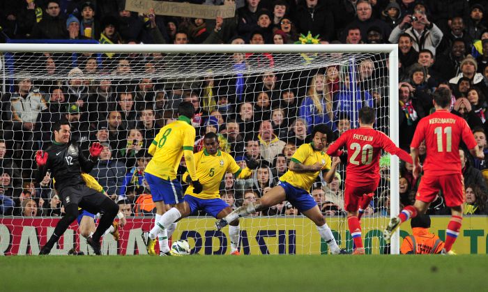 На 73-й минуте после контратаки россиян мяч заметался по штрафной площадке бразильцев - первый удар Жулио Сезар отразил, под второй удар лег защитник, третий - бразильцы выбили с ленточки ворот и только четвертый удар, который нанес Виктор Файзулин (на фото) привел к успеху - 1:0.
