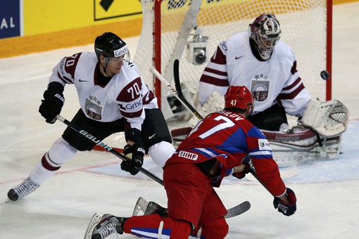 Россияне не оставили никаких надежд команде Латвии, которая не смогла ничего противопоставить действующему чемпиону мира. Счёт в матче открыл на 14-й минуте Евгений Бирюков, во втором периоде по разу отличились Евгений Медведев, Александр Радулов и Евгений Рясенский, а в завершающей двадцатиминутке забивали Илья Ковальчук и Кирилл Петров. Особенно красивым получился гол у Александра Радулова (на фото), который смог, находясь спиной к воротам соперника, послать шайбу точно в сетку.