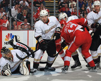 Пятый матч серии "Анахайм Дакс" - "Детройт Ред Уингз" в анахаймском "Хонда Центре" принес победу "уткам", сравнявшим счет за 32 секунды до окончания основного времени и забившим победную шайбу на 2-й минуте овертайма - 3:2. Счет в серии также стал 3:2 в пользу "Анахайма" и вице-капитан "красных крыльев" Павел Дацюк уже через два дня может завершить клубный сезон и присоединиться к сборной России на чемпионате мира. Авторами заброшенных шайб в пятом матче стали Кайл Палмиери, Райан Гетцлаф, Ник Бонино (все - "Анахайм"), Йохан Френцен и Микаэль Самуэльссон (оба - "Детройт"). Павел Дацюк (на фото в центре) сделал одну голевую передачу.