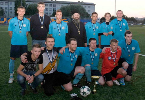 Руководитель молодежного отдела Нарвской епархии иерей Сергий Львов и глава православного молодежного клуба «Одигитрия» Екатерина Тихомирова вручили кубок и медали футболистам епархиального спортклуба, победившим в республиканском турнире Христианской футбольной лиги в сезоне 2013 года.