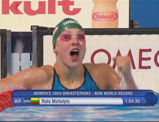 16-летняя литовка Рута Мейлютите, год назад поразившая спортивный мир победой на Олимпиаде в Лондоне, в полуфинале чемпионата мира 2013 года в Барселоне побила мировой рекорд на стометровке брассом - 1:04.35.