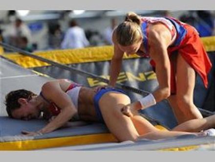 На фото: в секторе для прыжков с шестом лежит Юлия Голубчикова (чемпионат мира, Берлин, 2009 год)