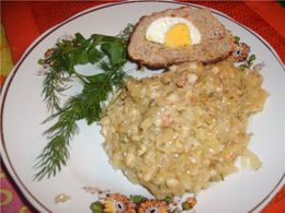 Свинину нарезать кусочками, посолить и уложить в котел слоями с капустой, в которую добавить лук и сахар. Добавить пряности и засыпать слоем перловой крупы (можно предварительно ее вымочить). Влить столько воды, чтобы она покрыла перловку. Тушить на плите или готовить в духовке до мягкости перловой крупы. Подавать мульгикапсад с отварным картофелем. |