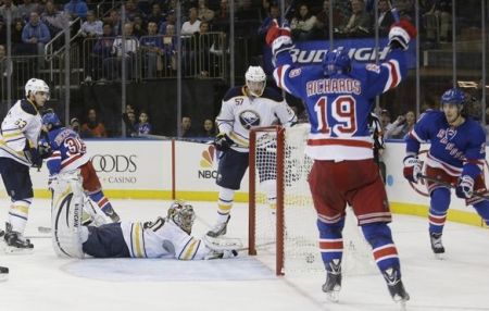 Хозяевам и поклонникам "Баффало Сейбрс" в турнирную таблицу лучше не смотреть - команда, которая провела больше всех матчей на Востоке - 15, набрала в них всего лишь 5 очков. С таким багажом о плей-офф мечтать сложно. Очередное поражение "Клинки" потерпели в Нью-Йорке от "Рейнджерс" (на фото) , которые также стартовали неважно - 0:2. Голы у нью-йоркцев забили Дерик Брассар и Крис Крейдер. После 12 игр "Рейнджеры" имеют 10 очков и делят в Восточной Конференции 10-13-е места с "Оттавой Сенаторс", "Вашингтон Кэпиталз" и "Нью-Джерси Дэвилз".