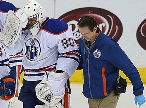На 37-й минуте встречи "Даллас Старз" - "Эдмонтон Ойлерс" голкипер "Нефтяников" Илья Брызгалов (на фото) получил травму верхней части тела после игрового столкновения с форвардом "Звезд" Райаном Гэрбаттом и покинул площадку с помощью врачей.