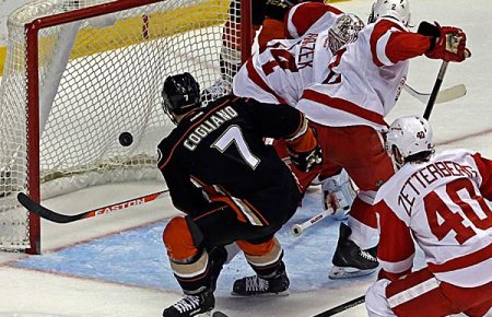 Более трех месяцев прошло со старта регулярного чемпионата, но "Анахайм Дакс" на своей площадке в основное время еще не проиграл. В очередном матче "Утки" одолели "Детройт Ред Уингз" с футбольным счетом 1:0. Единственный гол на 33-й минуте забил Эндрю Кольяно (на фото).