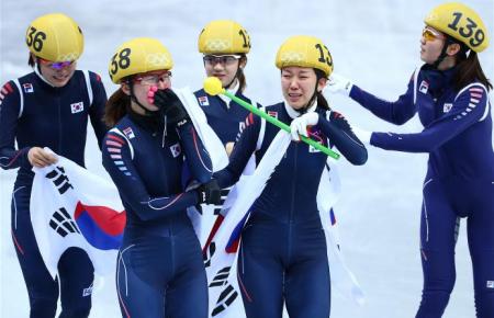 Южная Корея (в составе Ха-Ри Чо, Аланг Ким, Сын Хи Пак, Сангйонг Конг и Сук Хи Шим)  (на фото) отвоевала чемпионский титул, который удерживала на четырех Играх подряд, до того как ее победное шествие не прервали китаянки в Ванкувере в 2010 году. Китай, пытавшийся отстоять титул чемпиона, был дисквалифицирован в финале. Серебряные медали выиграли канадки Мэри-Эва Дроле, Джессика Хьюитт, Валери Мальте и Мариан Сен-Желе, а бронзовые - итальянки Арианна Фонтана, Лючия Перетти, Мартина Вальчепина и Елена Вивиани.