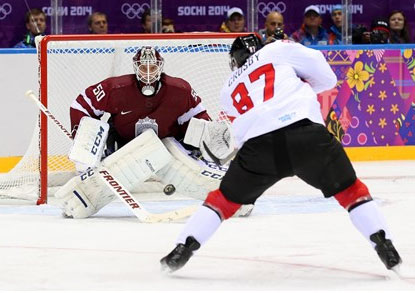 Канадцы с первых минут поединка с Латвией захватили игровую инициативу и когда на 14-й минуте достиг цели бросок Патрика Шарпа, показалось, что вот-вот соперник "посыплется", но этого не случилось. Через две с небольшим минуты латвийская сборная отыгралась после того, как Лаурис Дарзиньш реализовал чистый выход "один на один". Далее начался шквал атак на ворота наших южных соседей, которые на этот раз защищал Кристерс Гудлевскис (на фото). За матч он отразил 55 из 57 бросков, но всё-таки не смог сотворить настоящее чудо. Решающую шайбу мощнейшим броском от синей линии за семь минут до сирены забросил защитник Ши Уэбер, реализовав численное преимущество. Победив со счётом 2:1 команда Канады вышла в североамериканское дерби - в полуфинале ей предстоит сыграть против команды США.